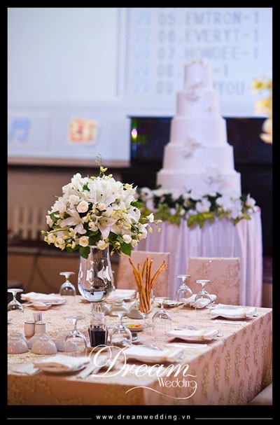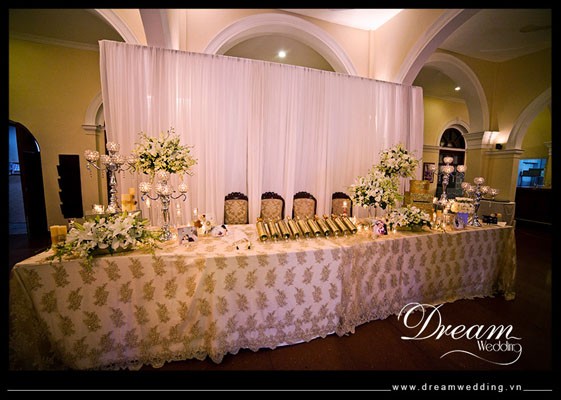 Đám cưới trang trí với tông trắng kết hợp với vàng gold (Duy Mẫn & Đài Trang)