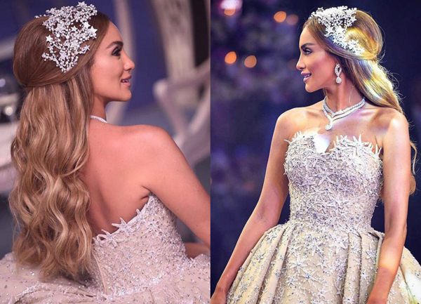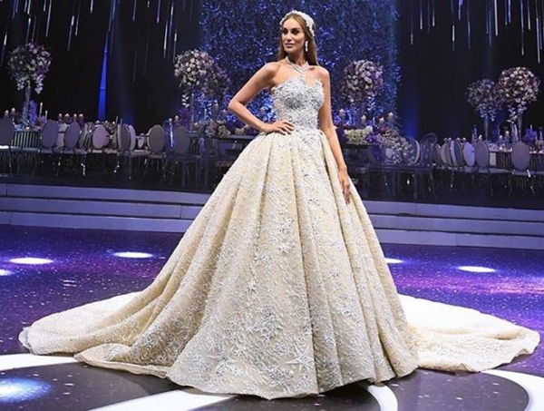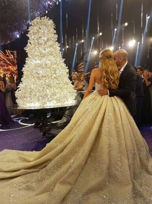 Trong ngày trọng đại, cô dâu Yasmina diện bộ soiree lộng lẫy được đính kết kỳ công của nhà thiết kế Zuhair Murad. Đây là cái tên được ví như ông hoàng của những bộ váy cưới Haute Couture.