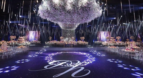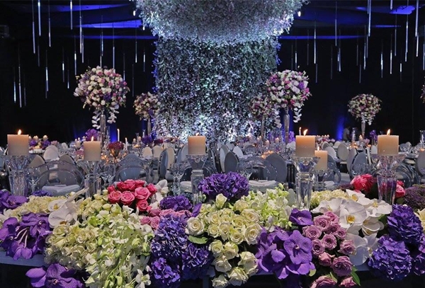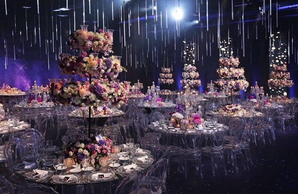 Không gian hoa lệ được tạo nên bởi ánh đèn, ánh nến và hàng nghìn đóa hoa tươi cao cấp.