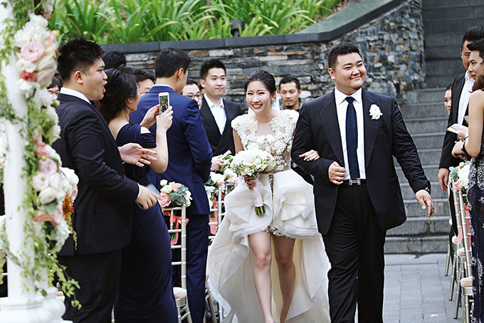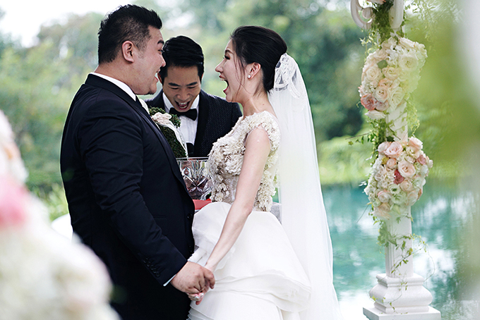 Cặp đôi chọn một khách sạn 6 sao ở Singapore để tổ chức đám cưới. Nghi lễ trao lời thề nguyền diễn ra bên bể bơi với phần trang trí lấy cảm hứng từ một chiến dịch thời trang nổi tiếng của thương hiệu Dior. Tiệc mừng tiếp nối sau đó trong hội trường của khách sạn.