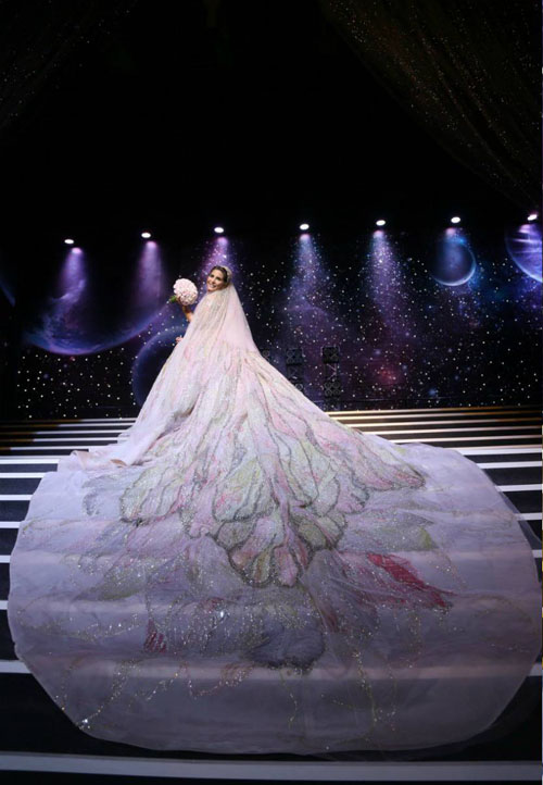 Cô dâu Reem diện bộ soiree của thương hiệu xa xỉ Elie Saab. Đây là một thiết kế lấy cảm hứng từ váy cưới của công chúa trong chuyện cổ tích. Đuôi váy dài hơn 3 mét đẹp như một bức tranh với hàng nghìn viên đá màu sắc đính thủ công.
