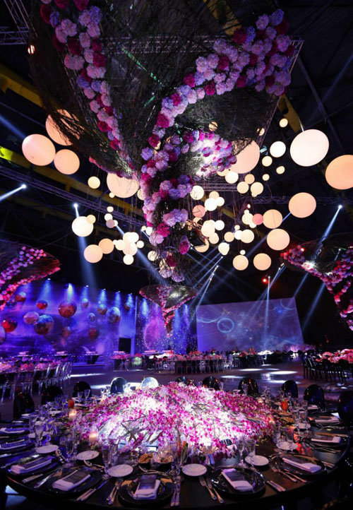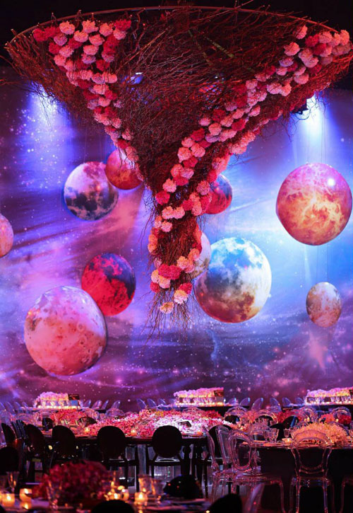 Không gian tiệc cưới choáng ngợp bởi tông màu nóng. Những quả cầu rủ xuống từ trần nhà tượng trưng cho các hành tinh của hệ mặt trời.