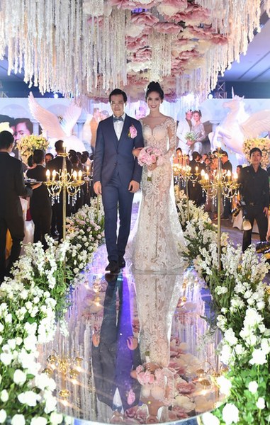 Không gian bữa tiệc ngập tràn trong hoa hồng, mẫu đơn, tú cầu... đây là dòng hoa được nhập khẩu từ Ý, Anh, Pháp và tươi nguyên 100%. Được biệt, số tiền dành cho hoa cưới lên đến vài tỉ đồng, chưa kể với những bức tượng được tạc riêng cho lễ cưới được làm mới toàn bộ