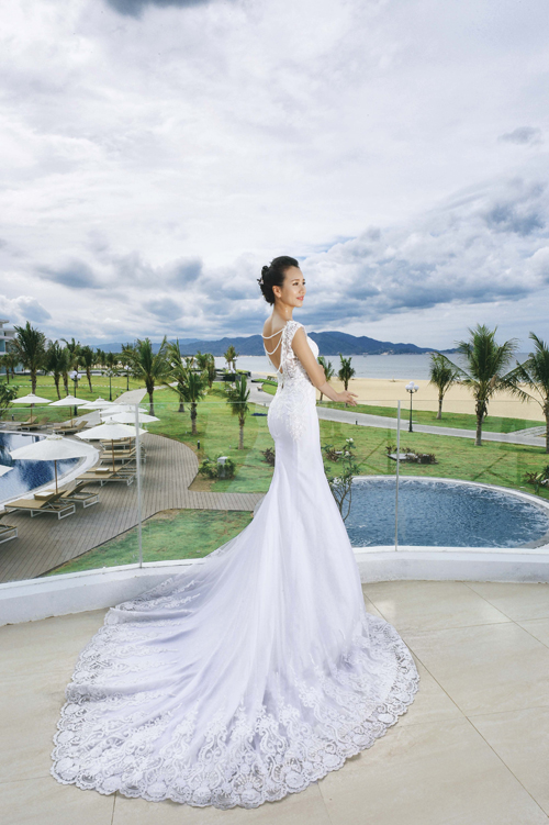 Váy đuôi cá mang hơi hướng hiện đại, thanh lịch với họa tiết ren phủ dọc thân váy.