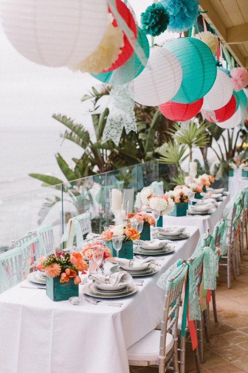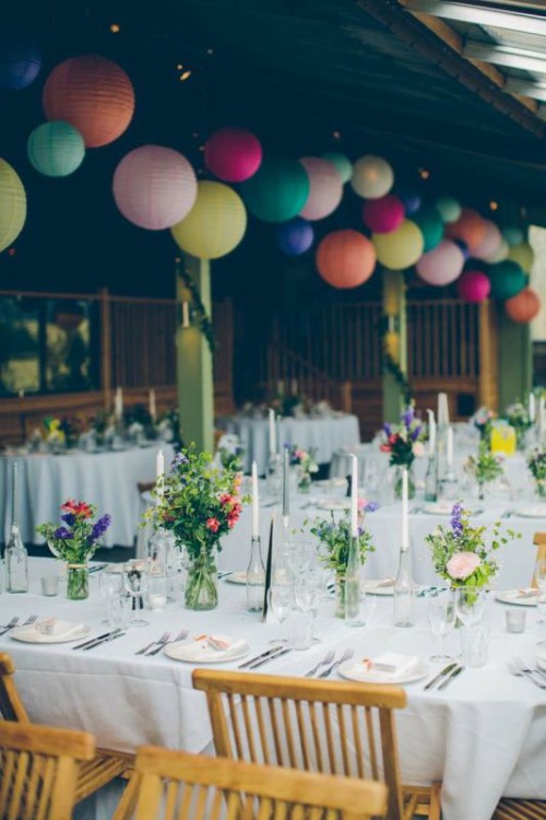 Đèn lồng màu sắc ton sur ton với hoa trang trí trên bàn tiệc.