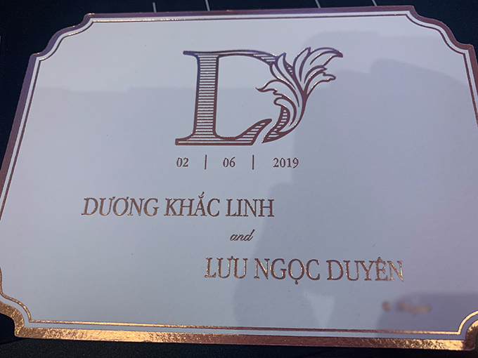 Mẫu thiệp mang tông hồng, trắng và vàng đồng được thiết kế đơn giản với chữ ghép từ ký tự tên cô dâu, chú rể. Theo nội dung in trên thiệp, đám cưới của Dương Khắc Linh - Lưu Ngọc Duyên (Sara Lưu) sẽ diễn ra vào tối 2/6 tại khách sạn thuộc trung tâm TP HCM. Tấm thiệp được nhạc sĩ đặt in với số lượng 250 tấm và mất hơn hai tuần để hoàn thiện.