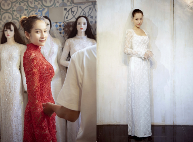 Hôm nay, cô dâu Sara Lưu cũng tiết lộ hình ảnh thử áo dài cưới của NTK Bảo Bảo trước ngày trọng đại. Nữ ca sĩ quyết định mặc áo dài trắng làm lễ gia tiên và sẽ mặc áo dài đỏ khi lên xe hoa về nhà chồng.
