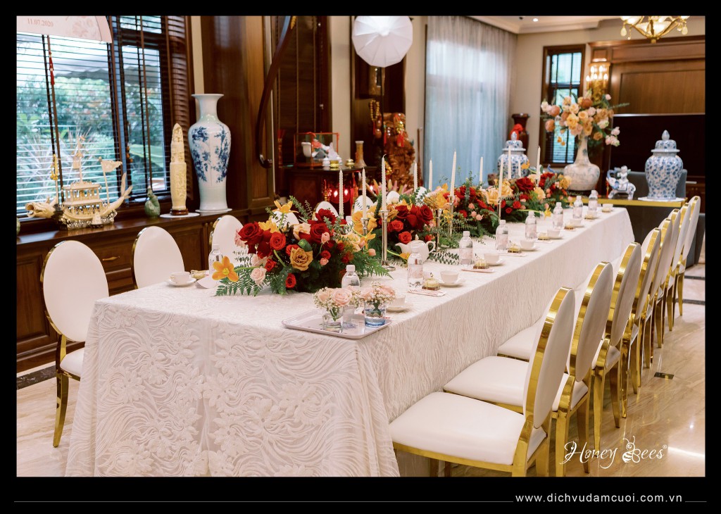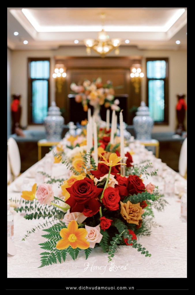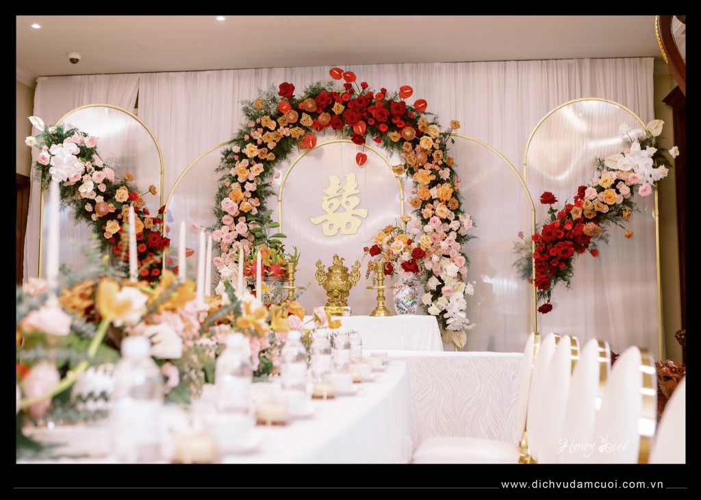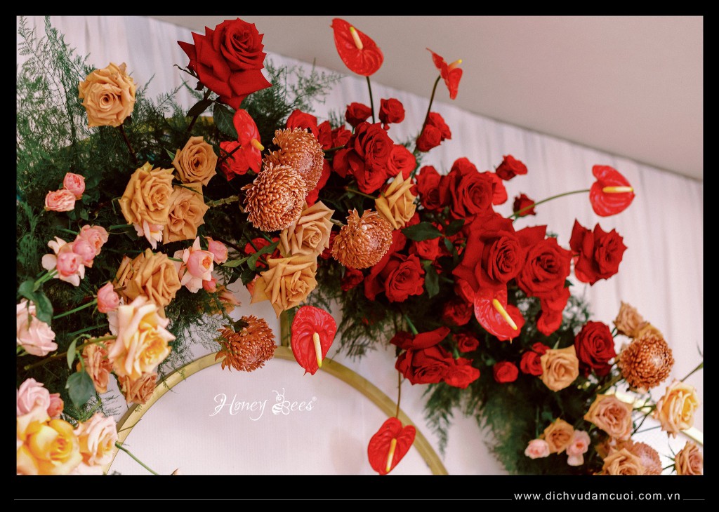 Một buổi lễ với gam màu rực rỡ và ấm áp của tone màu chủ đạo là đỏ và cam, gam màu thể hiện một tình yêu mãnh liệt, nồng cháy như tô điểm cho vẻ đẹp của hoàng hôn. Sự kết hợp này đã tạo nên một không gian lãng mạn, ấm cúng nhưng không kém phần ấn tượng khi cổng hoa được thiết kế chuyển màu khéo léo đã tô điểm cho buổi lễ thêm rực rỡ.