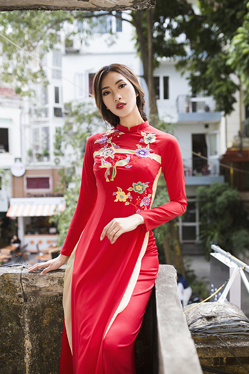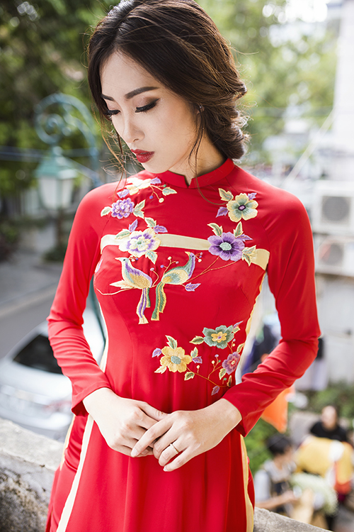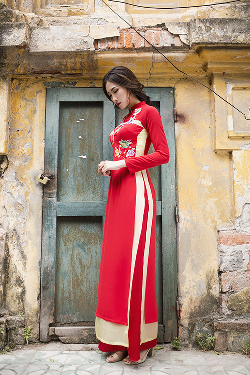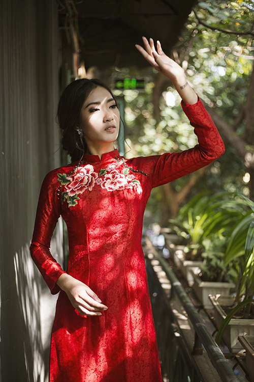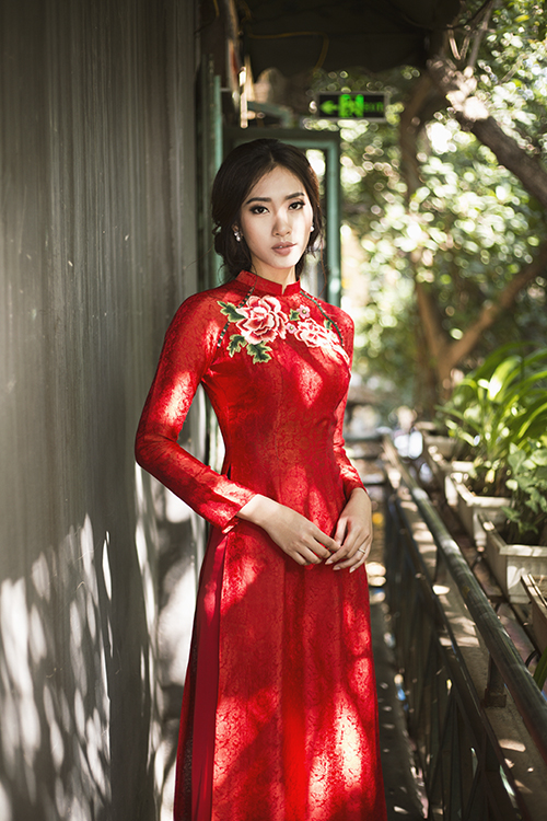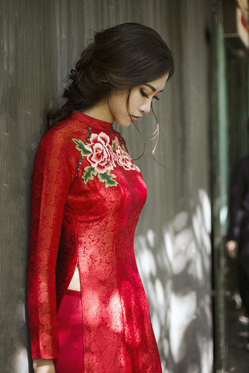 Cùng với váy cưới màu trắng, một bộ áo dài đỏ với phom dáng truyền thống, cổ cao, tay dài kín đáo sẽ là trang phục không thể thiếu giúp tôn nét duyên dáng, sang trọng của cô dâu.