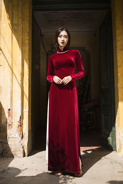 Với cô dâu yêu nét đẹp cổ điển, áo dài nhung sẽ là lựa chọn hoàn hảo. Chất liệu này phù hợp với tiết trời se lạnh của mùa xuân.