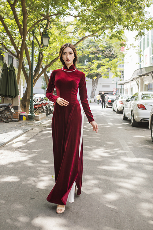 Tà áo có độ dài vừa phải cùng đường chiết eo cao giúp bộ áo dài nhung không bị già. Trong năm 2017, chất liệu nhung được dự đoán sẽ lên ngôi, trở thành nguồn cảm hứng mới cho các nhà thiết kế.