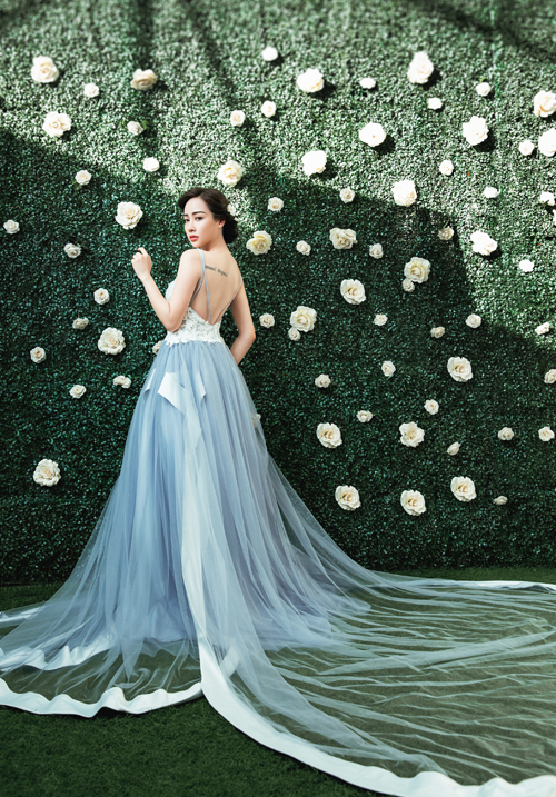Những bông hoa nổi trên thân và đuôi váy được tạo nên nhờ kỹ thuật xếp lớp đan xen thành hình khối ấn tượng, có hiệu ứng đặc biệt khi lên ảnh.