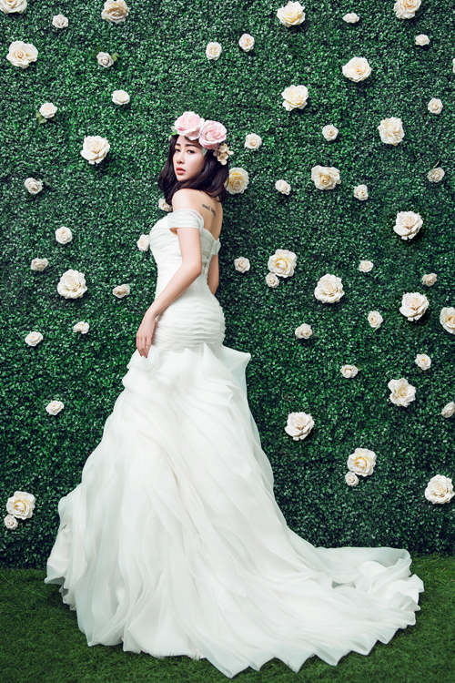Váy có tay được tạo dáng ôm sát từ ngực tới vòng hai rồi xòe xộng, giúp cô dâu giấu được nhiều nhược điểm cơ thể. Đường cắt táo bạo lấy cảm hứng từ áo yếm tôn bờ vai và lưng trần quyến rũ.