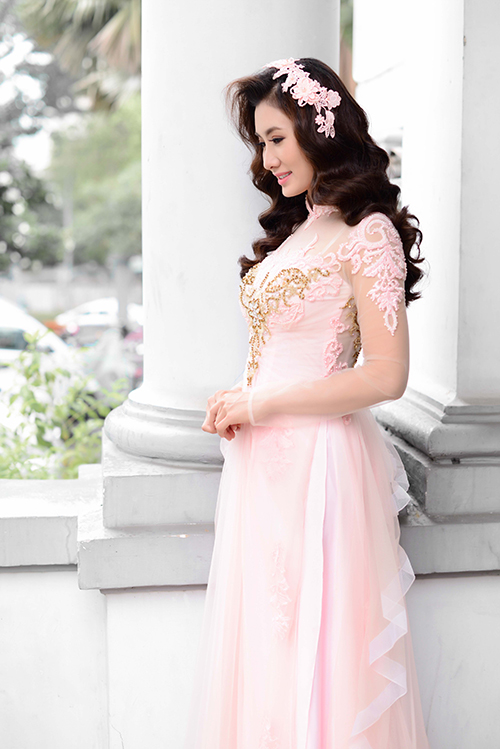 Các cô dâu sẽ trở nên ngọt ngào và lãng mạn hơn khi diện áo dài với chất liệu ren màu hồng pastel.