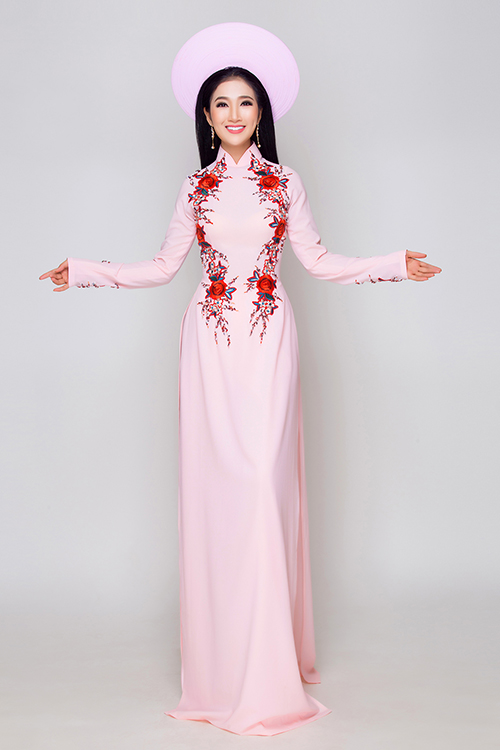 Ngoài những mẫu áo dài cầu kỳ cho ngày cưới, cô dâu có thể chọn những thiết kế đơn giản, vừa mới mẻ lại dễ dàng tái sử dụng sau hôn lễ. Sắc hồng phấn dịu dàng giúp tôn vinh nét nữ tính, lãng mạn cho tân nương. Cổ cao truyền thống được thêu chờm giúp khuôn mặt thêm tươi sáng, rạng rỡ.