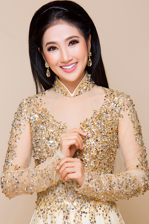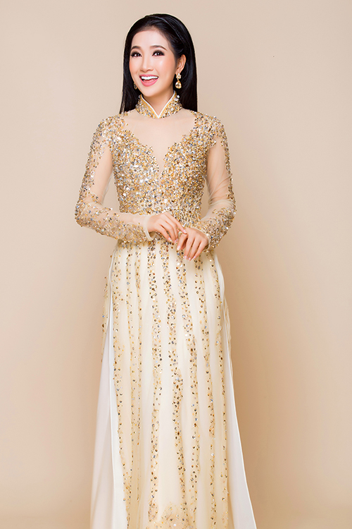 Diễn viên Quỳnh Lam hoá cô dâu trong mẫu áo dài màu be đắp ren điệu đà, lấy cảm hứng từ váy cưới.