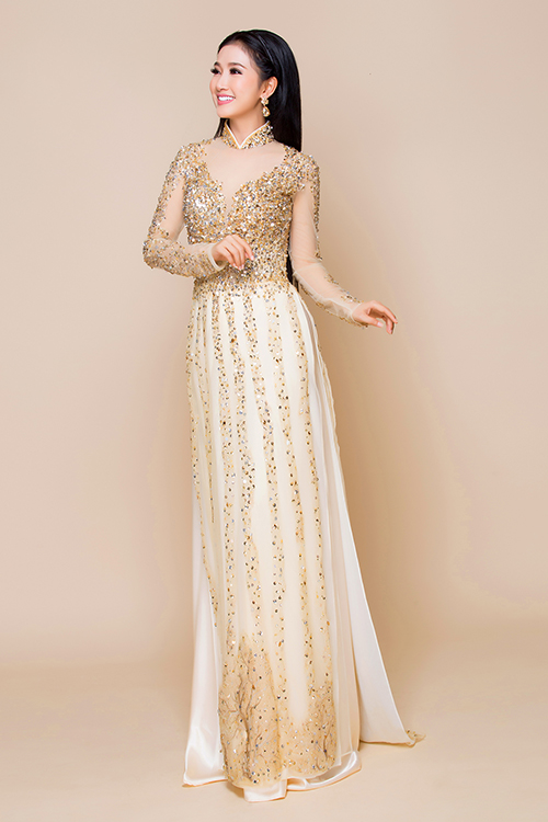 Tân nương nên tránh chọn áo dài có hoạ tiết rườm rà, tà áo quá luộm thuộm vì nuốt dáng, tạo cảm giác thiếu gọn gàng, chỉn chu. Thay vào đó, hoạ tiết đính kết mềm mại, nhấn vào ngực áo, cánh tay và chạy viền ở tà áo sẽ giúp bạn nổi bật.