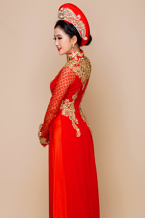 Trong ngày trọng đại, tone màu đỏ luôn được ưu ái hơn cả. Không chỉ mang ý nghĩa hạnh phúc, may mắn, màu đỏ còn giúp đánh lừa thị giác, mang đến cho cô dâu vóc dáng nhỏ nhắn hơn.