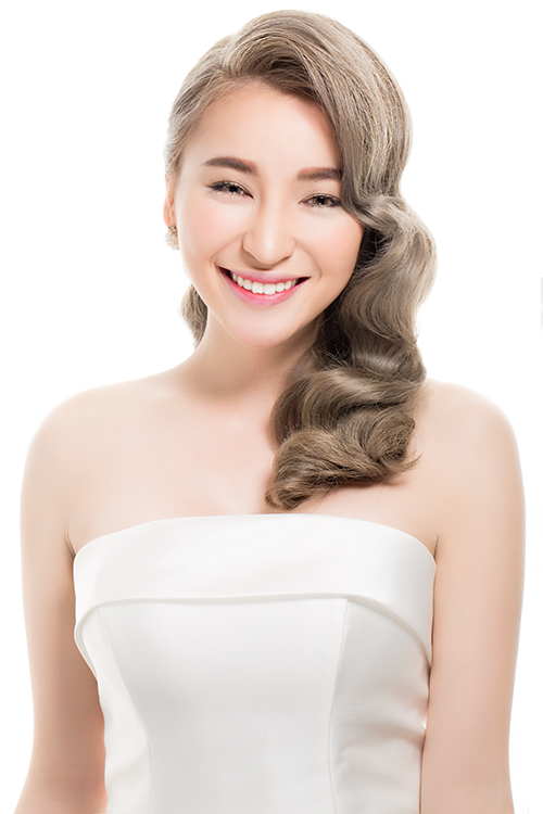 Lớp nền được đánh mỏng, nhẹ để giữ vẻ tự nhiên cho tân nương ngày cưới. Điểm nhấn trên gương mặt là đôi môi hồng baby căng mọng hợp mốt.