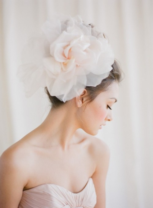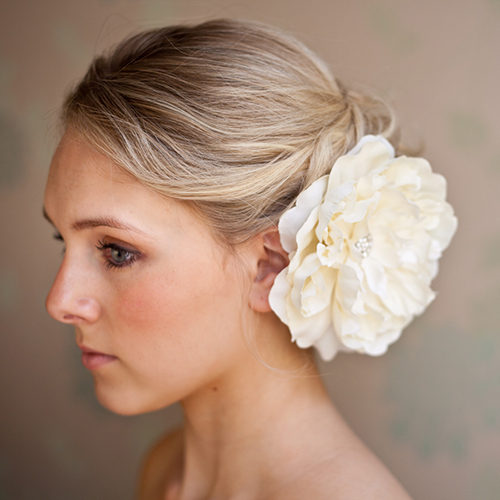 Hoa cỡ đại phù hợp với kiểu tóc búi gọn gàng cùng trang phục cưới đơn giản.