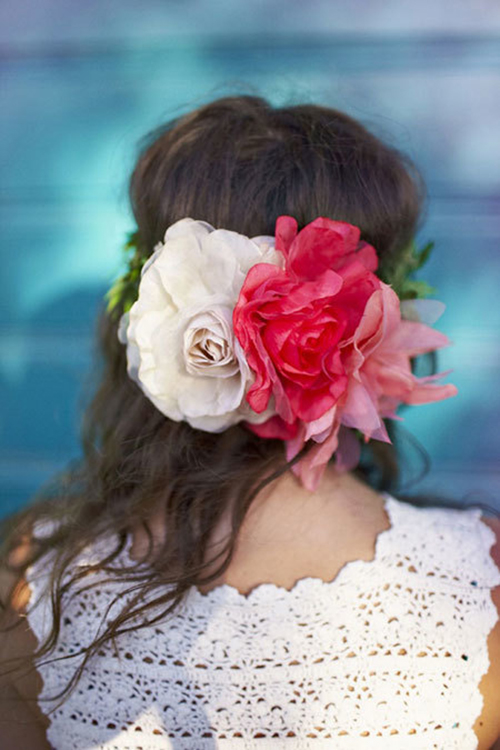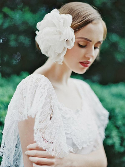 Dù lựa chọn phong cách hiện đại hay vintage cổ điển, những bông hoa cài tóc luôn là loại phụ kiện tô điểm thêm vẻ lãng mạn, ngọt ngào cho cô dâu. Bên cạnh vòng hoa nhí hay phụ kiện kim loại thường thấy, những bông hoa cài tóc cỡ đại được đánh giá cao bởi tính thời trang, sự phá cách nhưng vẫn trong khuôn khổ.