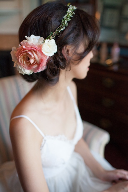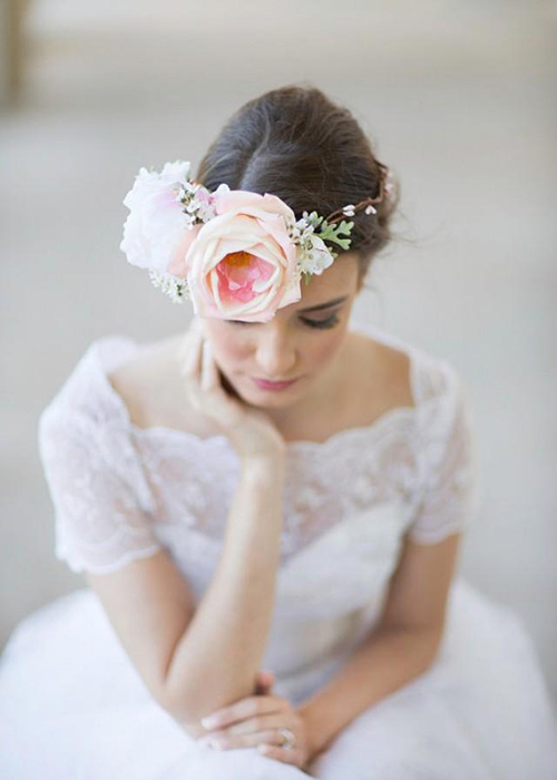 Thay vì dùng khăn voan, các cô dâu có thể tìm đến phụ kiện hoa để tạo sự lãng mạn. Bạn nên chọn các loại hoa có màu sắc nhạt như trắng, vàng kem hoặc hồng phấn để phù hợp với sắc trắng của váy cưới.