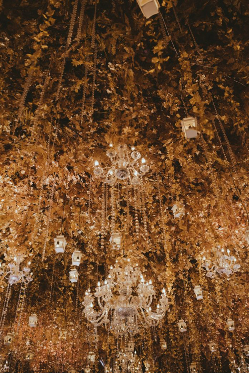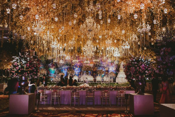 Hàng chục chiếc đèn chùm, hàng ngàn dây pha lê, hoa rủ màu vàng và nến đã tạo ra không gian lung linh, huyền ảo đến khó tin cho tiệc cưới.