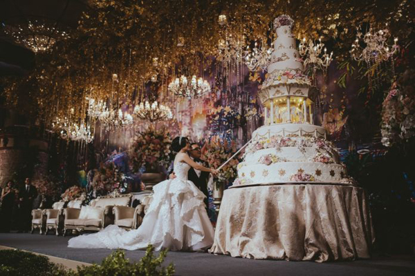 Chiếc bánh cưới cao gần 4 mét màu trắng kem điểm hoa màu pastel là điểm nhấn đặc biệt trên sân khấu 'thần tiên'.