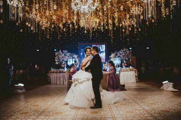 Anthony và Shella khiến các khách mời 'lóa mắt' với không gian tiệc cưới ngập sắc vàng đồng, lãng mạn như trong truyện cổ tích.