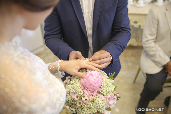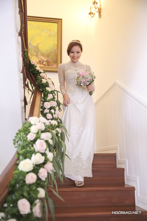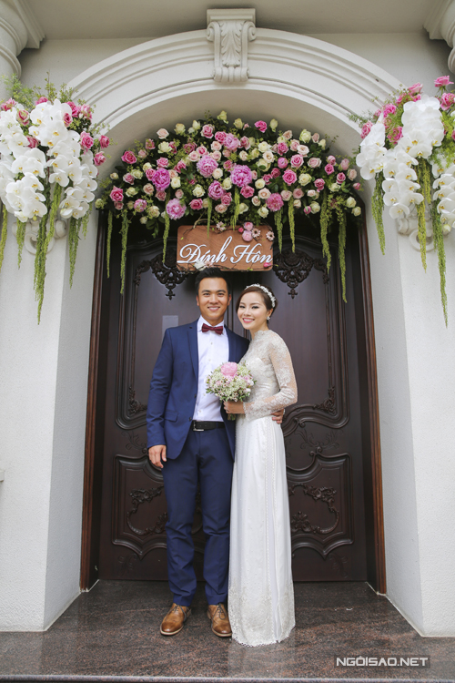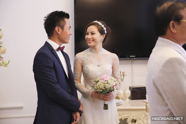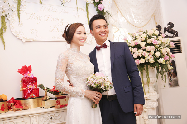Cô dâu Thùy Dương diện chiếc áo dài trắng đính ngọc trai tinh tế của nhà thiết kế Minh Khoa. Chú rể Duy Nhất lựa chọn bộ vest màu xanh navy thanh lịch, trẻ trung.
