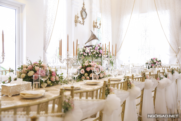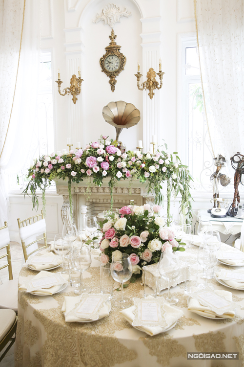 Tư gia nhà gái được trang trí với phong cách châu Âu sang trọng, cổ điển. Hoa hồng, hoa mẫu đơn tông hồng - trắng được Thùy Dương lựa chọn cho lễ đính hôn.