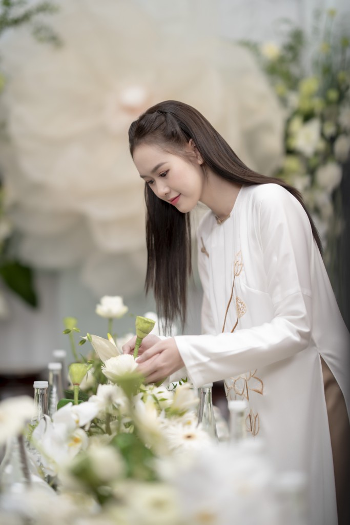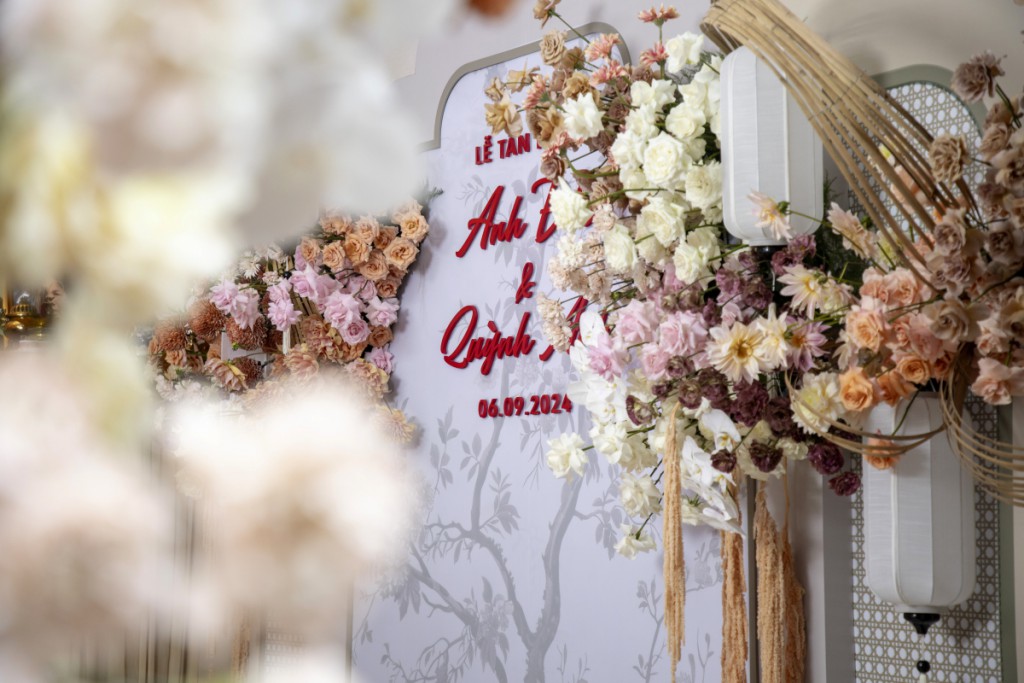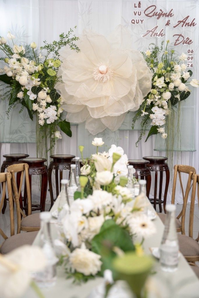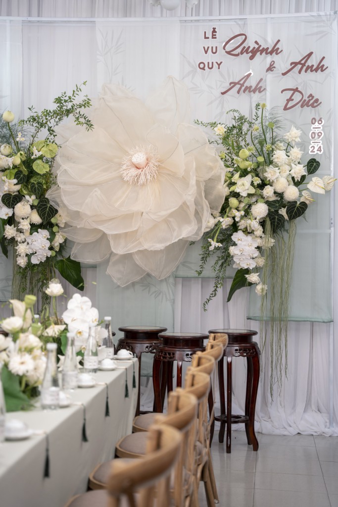Tại nhà của cô dâu Anh Phạm, ý tưởng trang trí lễ gia tiên (kết hợp lễ ăn hỏi, vu quy) được lấy cảm hứng từ hoa sen, loài hoa mà cô dâu yêu thích. Bên cạnh đó, hoa sen còn là biểu tượng cho tình yêu thuần khiết, thể hiện mong muốn xây dựng cuộc hôn nhân hạnh phúc. Ảnh: Maison de Bil