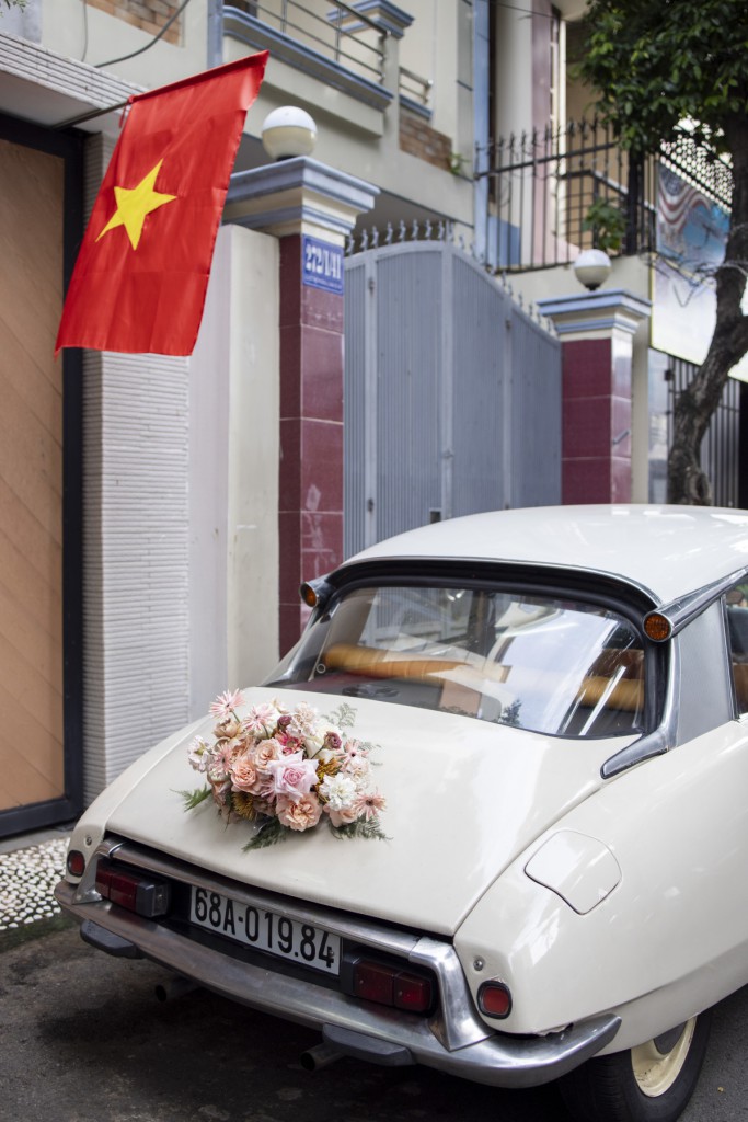 Chú rể Anh Đức sử dụng xe hơi cổ làm phương tiện rước dâu, phù hợp với ý tưởng thiết kế lễ ăn hỏi.