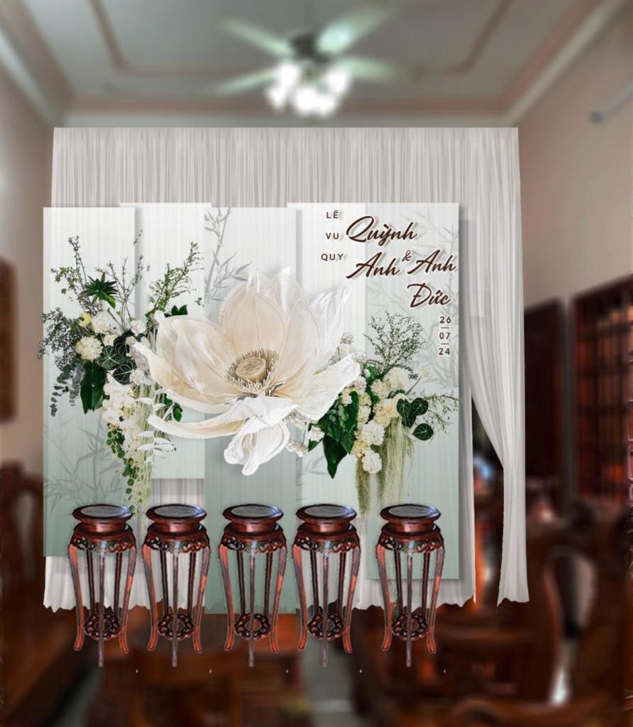 Điểm nhấn trang trí tại nhà cô dâu là họa tiết hoa sen khổng lồ làm bằng vải 3D nổi. Êkíp sử dụng chất liệu dân gian của Việt Nam và thân thiện với môi trường như tre, nứa, gỗ để sáng tạo.