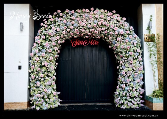 Trang trí lễ gia tiên, trang trí lễ vu quy, trang trí lễ đính hôn - cổng hoa full hoa đặt phía trước cổng chính