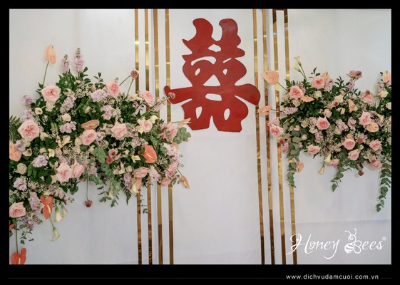 Trang trí lễ gia tiên, trang trí lễ vu quy, trang trí lễ đính hôn - chữ hỷ màu đỏ treo trên phông hoa tươi