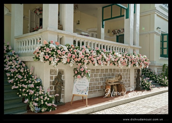 Lễ tân hôn CR Tuấn Anh & CD Quỳnh Hương tổ chức tại tư gia nhà CR được Honey Bees thiết kế và trang trí theo tông màu chủ đạo là trắng, hồng pastel với nhiều khu vực được trang trí hoa tươi