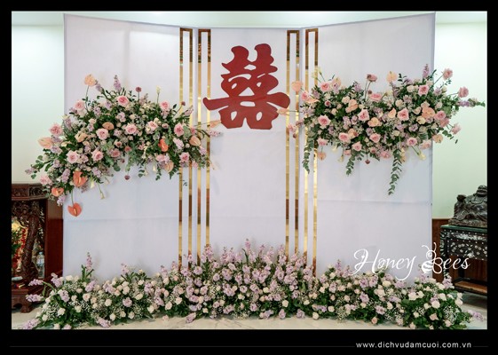 Trang trí lễ gia tiên, trang trí lễ vu quy, trang trí lễ đính hôn - phông nền màu trắng, trang trí hoa tươi