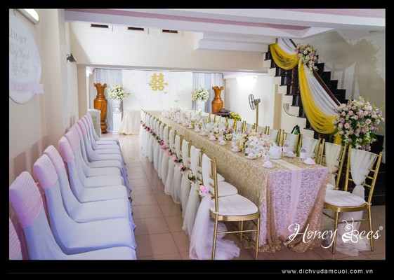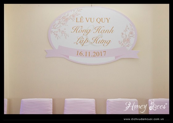 Lễ vu quy CD Hồng Hạnh & CR Lập Hưng tổ chức tại tư gia nhà gái được Honey Bees thiết kế và trang trí dựa theo tông màu chủ đạo là hồng pastel, trắng kết hợp với các phụ kiện vàng đồng.
