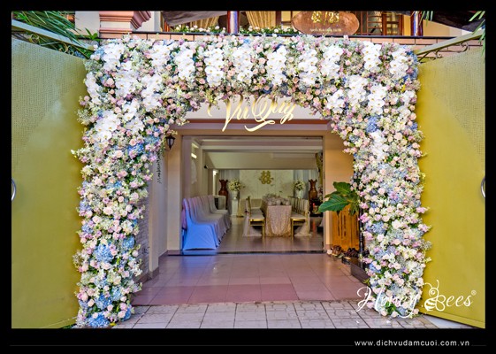 Trang trí lễ vu quy, trang trí lễ gia tiên - cổng hoa với các loại hoa như hồng, lan hồ điệp, hoa bi trắng và tú cầu xanh biển