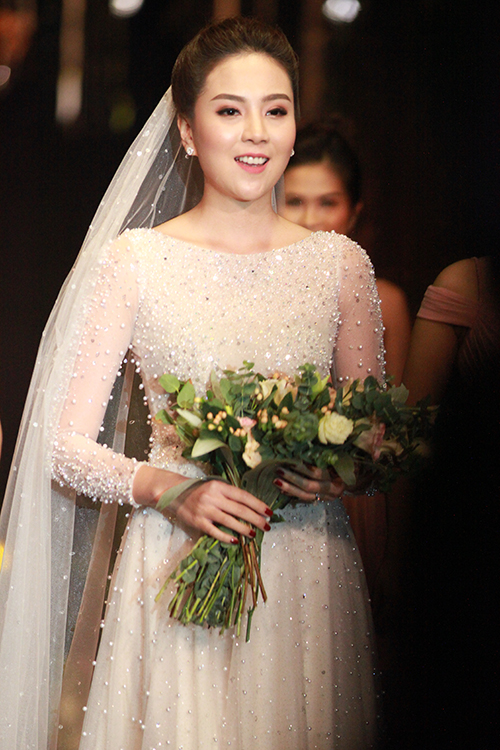 Khác xa với hình ảnh lạnh lùng trong các shot hình thời trang, trong trang phục cô dâu, Minh Tú thể hiện nét đẹp ngọt ngào, e lệ của cô dâu khi về nhà chồng.