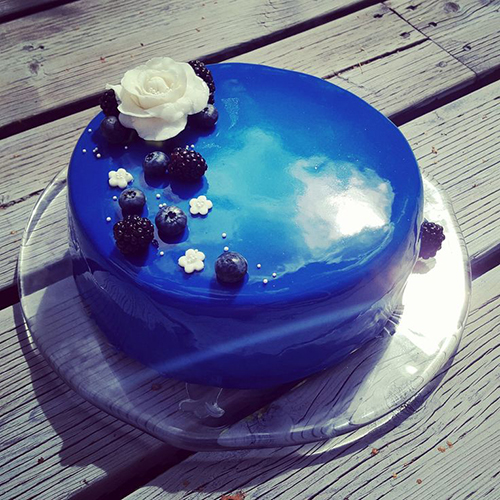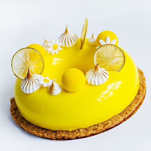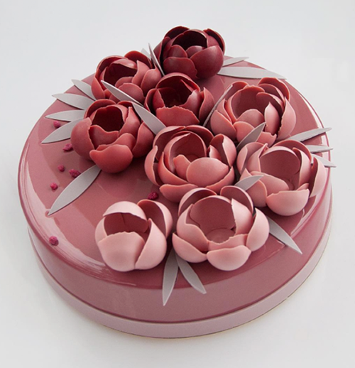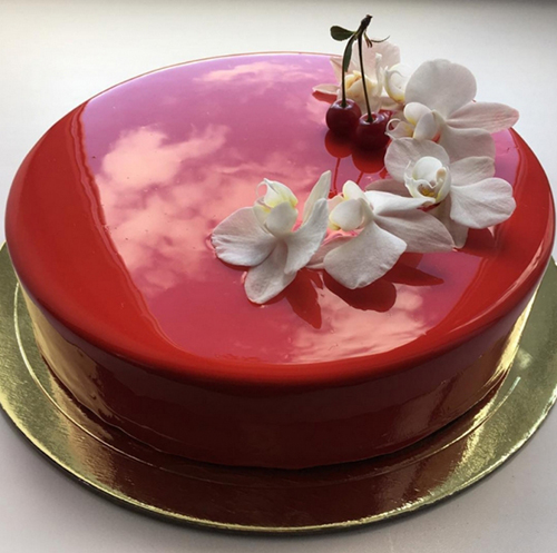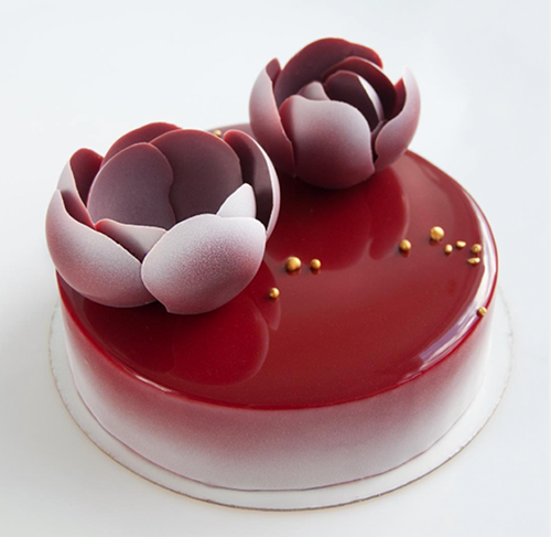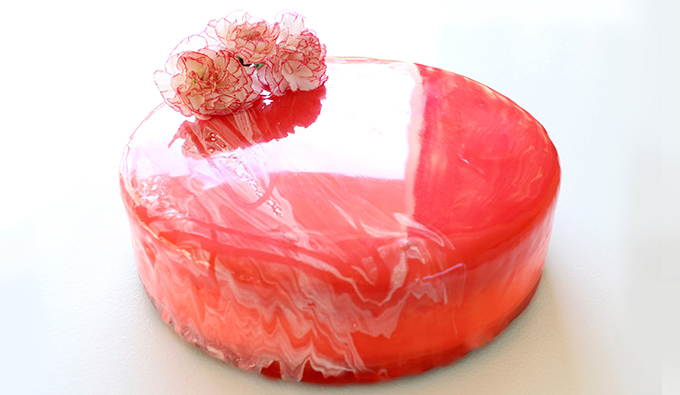 Nghệ nhân làm bánh đã phủ một lớp gelatin sánh mịn tạo độ óng ánh cho chiếc bánh như một tấm gương, phần nhân bánh là một tổ hợp gồm nhiều lớp như mousse, kem, bánh bông lan và mứt trái cây.