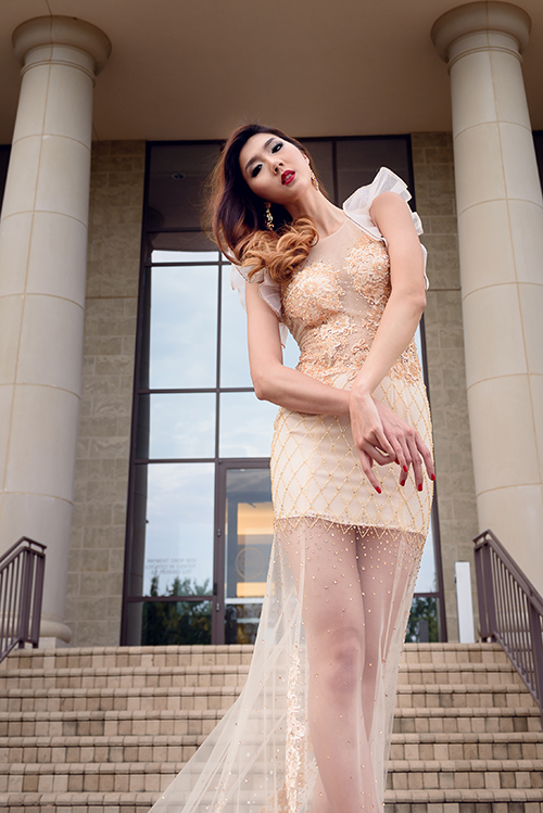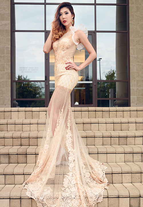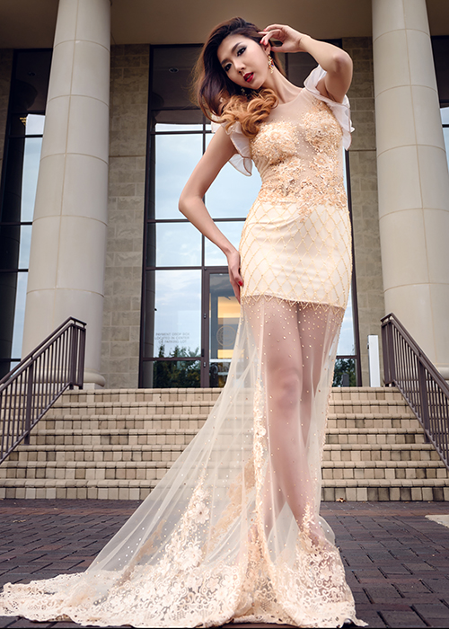 Điểm nhấn của bộ soiree này là phần ngực may bằng ren trong suốt, đính đá tỉ mỉ theo đường cong cơ thể. Chân váy làm từ voan trong suốt, tạo khoảng hở hợp lý cho váy cưới, đồng thời khoe đôi chân dài cho cô dâu.