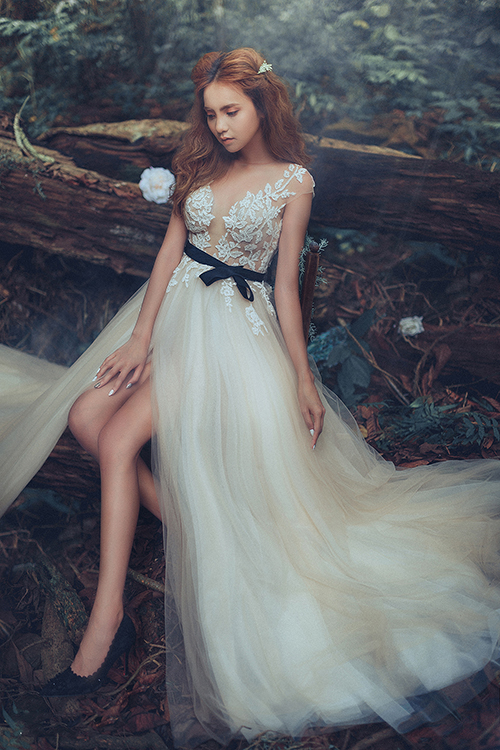 Bộ soiree dáng cổ điển, chân váy xoè rộng, được dựng phom bằng nhiều lớp vải lưới bồng bềnh với điểm nhấn ngực váy nửa kín nửa hở, phù hợp với không gian tiệc cưới lãng mạn.
