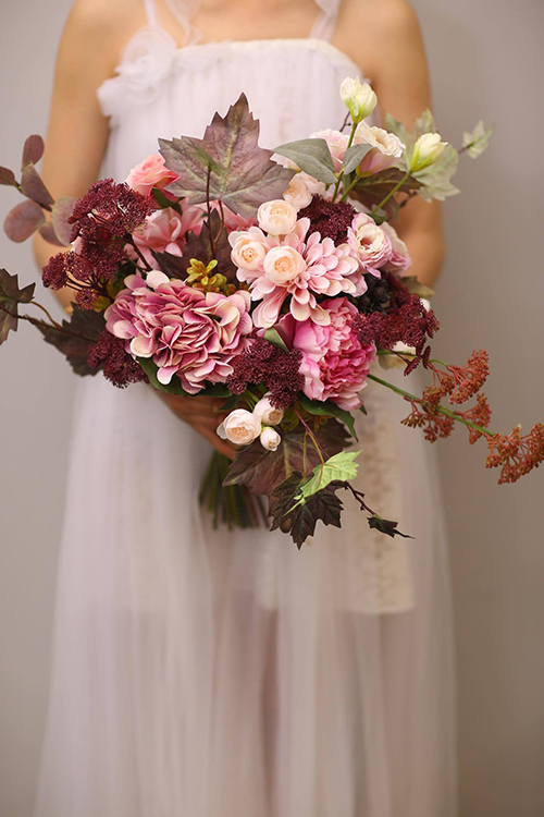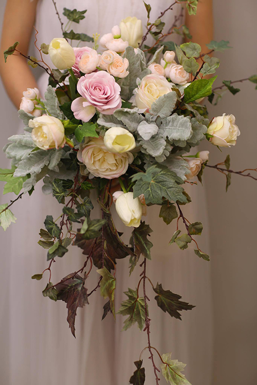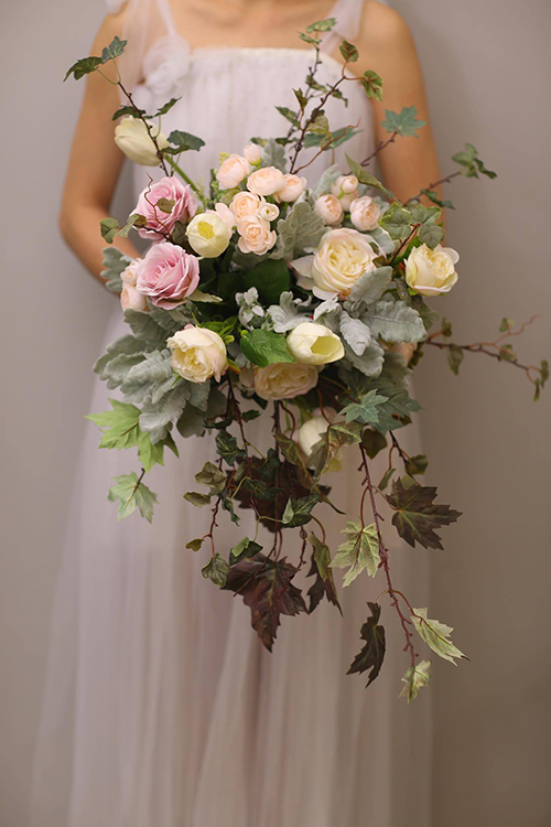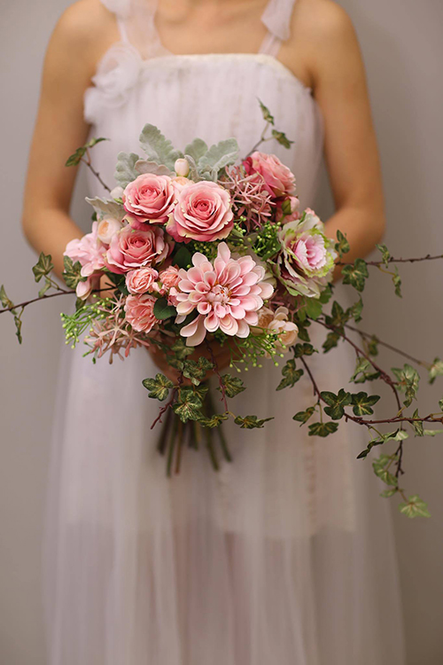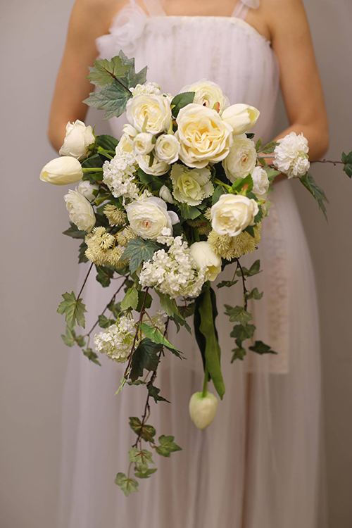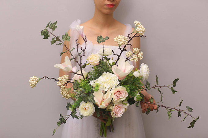 Đa số cô dâu phương Đông đều thích một bó hoa gam màu nhạt, có thể mang sắc trắng, hồng hay cam hồng, hoà hợp với váy cưới.