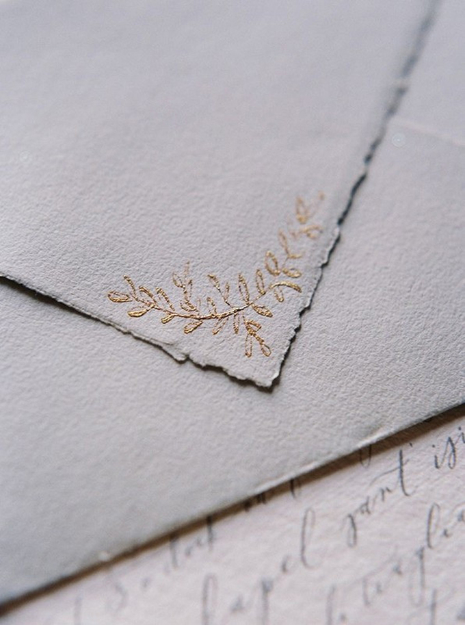 Mực màu vàng đồng giúp tấm thiệp có vẻ hiện đại, thời thượng. Bạn có thể vẽ hình ảnh lá nguyệt quế với màu mực này để tạo thành điểm nhấn cho tấm thiệp cưới. Một số lựa chọn màu sắc khác cho bạn gồm: mực màu bạc trên giấy đen, mực màu vàng hồng trên giấy trắng hoặc mực trắng nhũ trên giấy vàng.