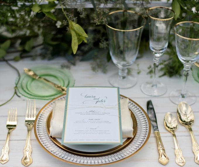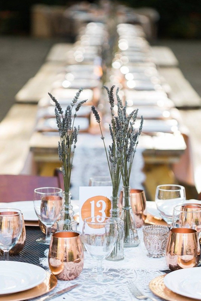 Đối với đám cưới đề cao sự thanh lịch, bạn có thể sử dụng đồ gia dụng mang sắc vàng đồng giúp bàn ăn thêm đẹp mắt.