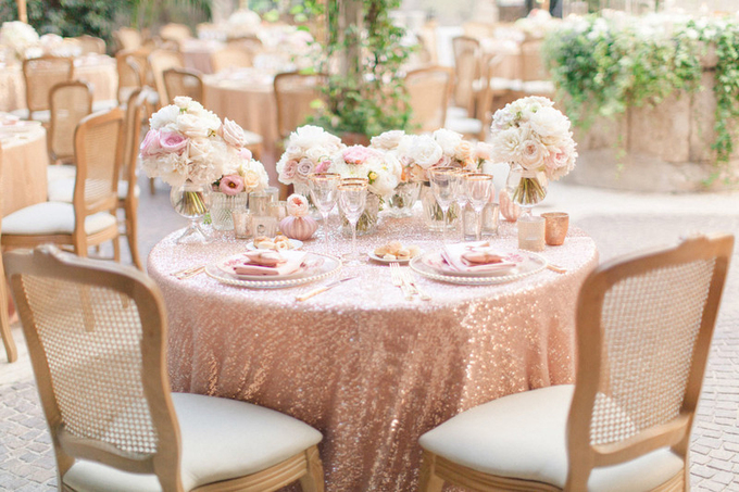 Nếu bạn muốn mang đến vẻ quyến rũ, lãng mạn tột bậc cho không gian, loại khăn này sẽ là một gợi ý đáng cân nhắc. Các chi tiết hoa màu hồng, trắng và ghế gỗ màu vàng nâu sẽ là yếu tố được dùng để kết hợp với khăn trải bàn ánh kim.