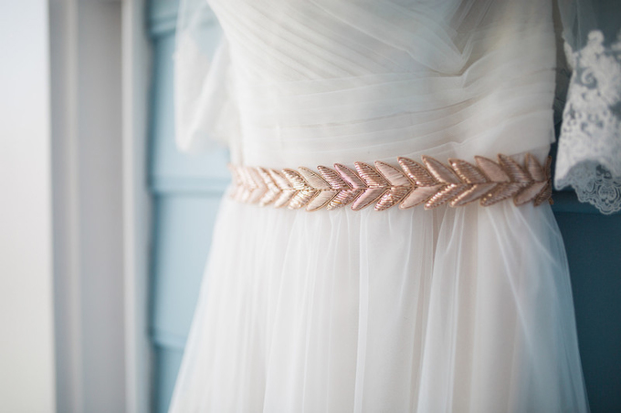 Hãy tô điểm cho váy cưới trắng tinh khôi của bạn với một chiếc thắt lưng màu vàng đồng. Đây sẽ là lựa chọn phù hợp cho đám cưới diễn ra trong sân vườn hoặc hôn lễ ở ngoài trời.