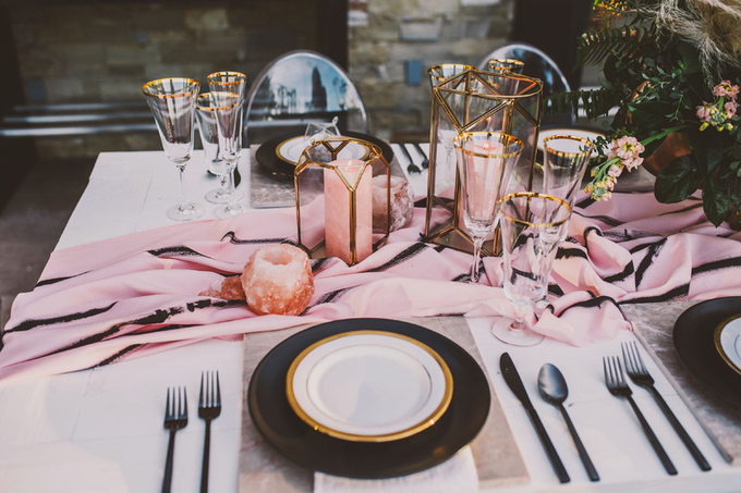 Nét gai góc của giá nến đa giác được tiết chế bởi sắc hồng pastel nhẹ dịu của những cây nến và khăn trải bàn. Ngoài màu hồng, bạn có thể sử dụng màu xanh baby blue hoặc các gam màu trung tính để tạo hiệu ứng thị giác ấn tượng.